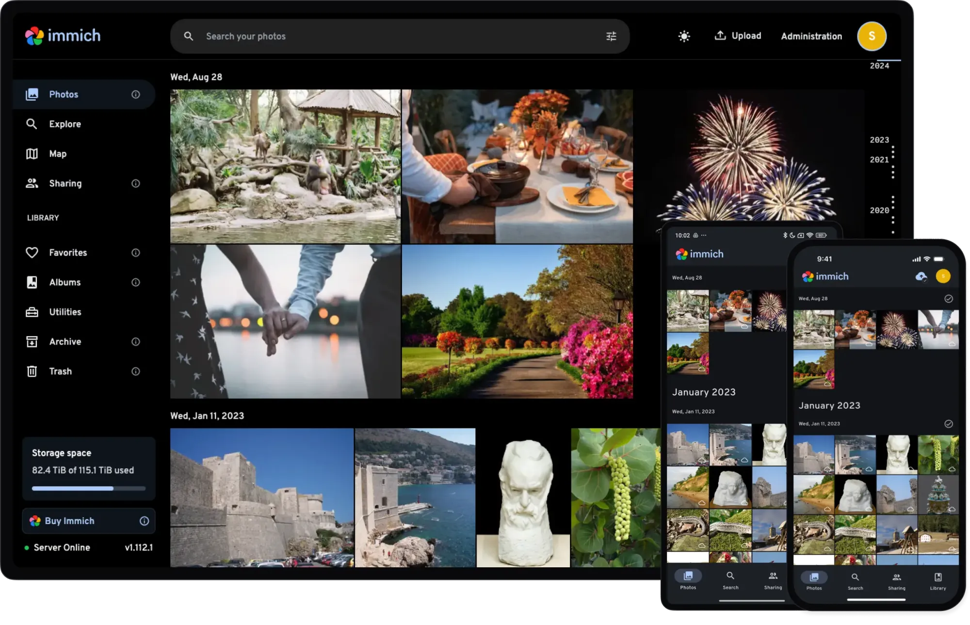 - Le "Clone" Visuel : Immich est conçu pour ressembler à 90% à Google Photos. L'interface est quasi identique : timeline, carte du monde, souvenirs ("il y a 1 an").