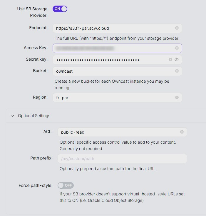 Dans l'interface Owncast Admin > Video Storage > S3 Storage :