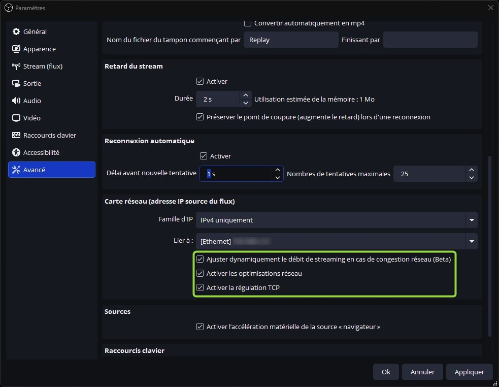 | Cocher "Débit Dynamique" dans OBS | Pour éviter les coupures quand un nuage passe. |